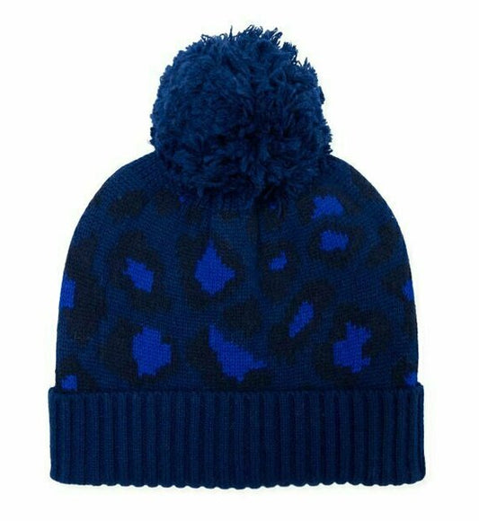 These beautiful 100% cashmere knit beanie hats are super soft and warm, in this fun navy, cobalt and black leopard print.