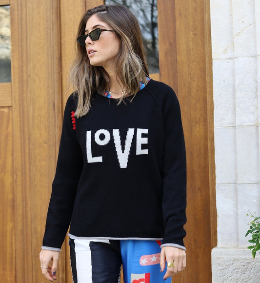 This is super stylish Me369 jumper in black with red hearts at the top of one of the sleeves, 'Love' slogan across the front in soft white and mid grey trim on the cuffs and hem. Boxy in shape and finishing at a flattering length, whether worn layered up or on its own it is a really fun and versatile jumper that oozes style.