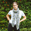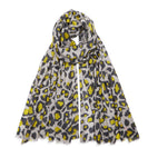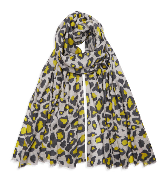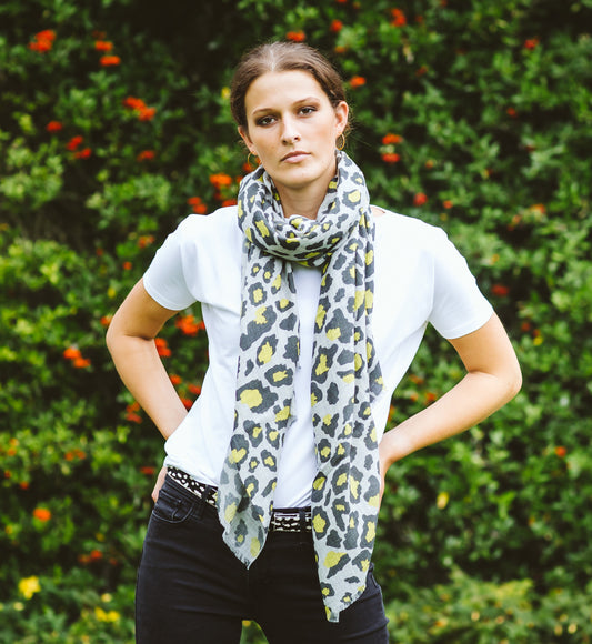 Stunning Mid Grey, Dark Khaki and Yellow Leopard Cashmere Pashmina.  A sumptuous soft fabric, that has such a luxurious feel. This scarf is a wardrobe classic, and both the print and the colour can work with numerous outfits. This scarf can be worn multiple ways, around the neck, or as a shawl, it's a wardrobe must have.